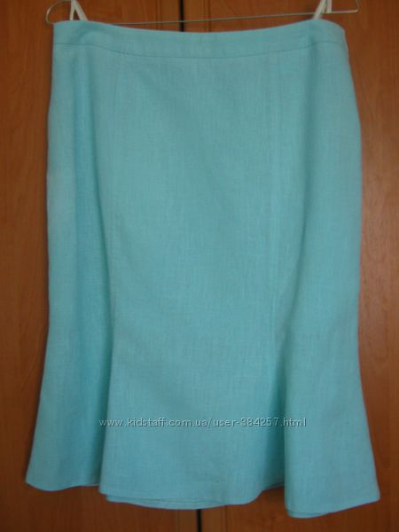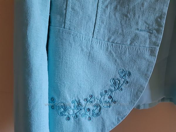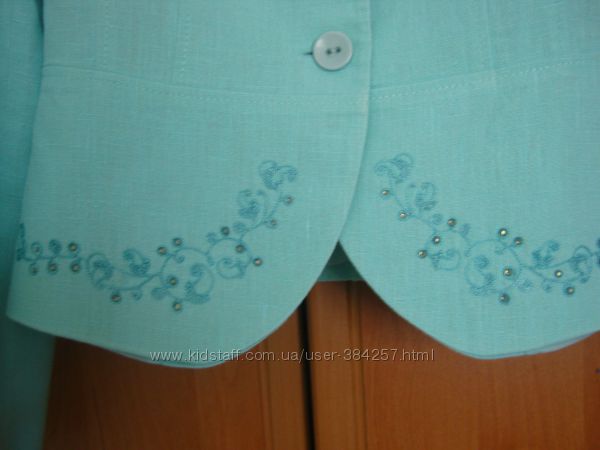 Красивый костюм. Юбка-годе и пиджак. Пиджак украшен вышивкой и камешками. Состав-лен. Изумительный цвет мяты. Подходит на размер 44-46. Пиджак-ПОГ-46см ПОТ-38см Длина рукава-61см Длина пиджака-56см Юбка- ПОТ-40см ПОБ-48см