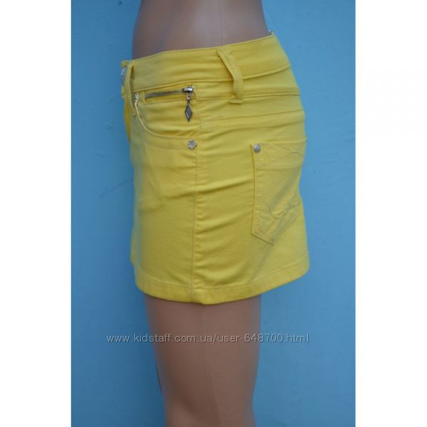 Желтая короткая юбка отлично сочетается с любым верхом. Есть 4 кармана, 2 молнии обманки. Застегивается на пуговицу и молнию.