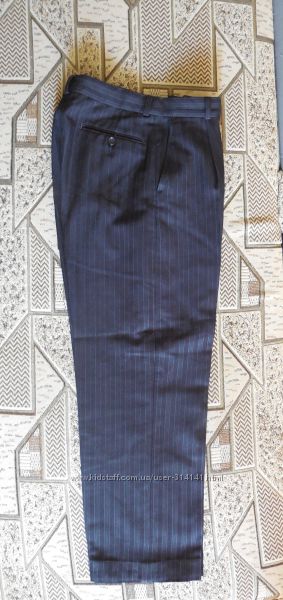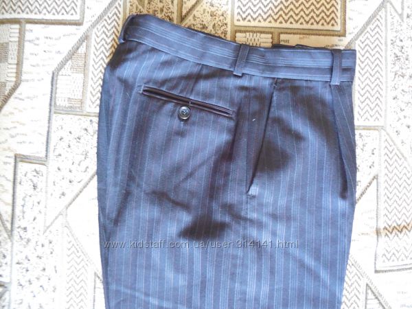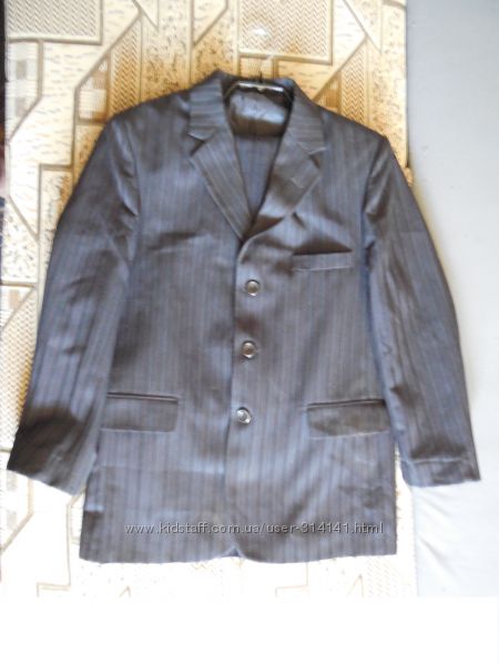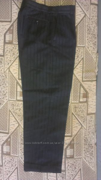 КостюмЦвет костюма черный с вертикальными полосками. Костюм в отличном состоянии, без изъянов. В использовании был не долго . На пиджаке боковые карманы – обманки, есть внутренний карман. Пиджак застегивается на три пуговицы. Брюки прямого кроя, боковые и задние карманы.