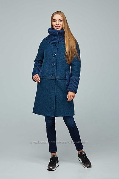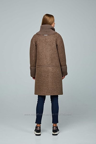Пальто декорировано строчками, подрезами, металлическим украшением, деталями из трикотажного полотна - в виде манжет и на карманах.