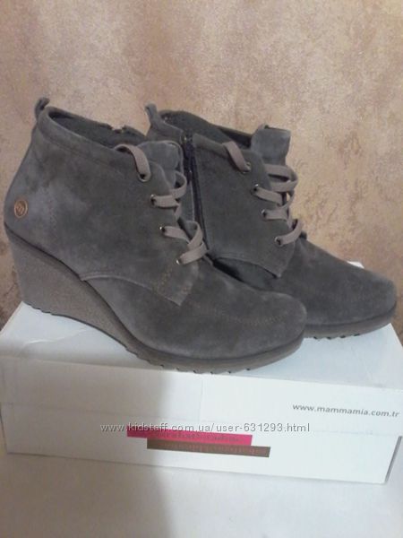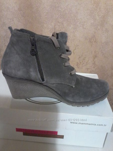 Новые, удобные и практичные демисезонные ботинки Mammamia, производство - Турция, на танкетке, колодка удобная( взула і забула ), отличный выбор на каждый день. Цвет - бежевый, шнурки прорезинены, для удобства есть замочек. Верх - натуральная замша, утеплены флисом. Высота танкетки 5.5 см Длина стельки 24 - 24.5 см., подойдут на ногу 23.5 см.