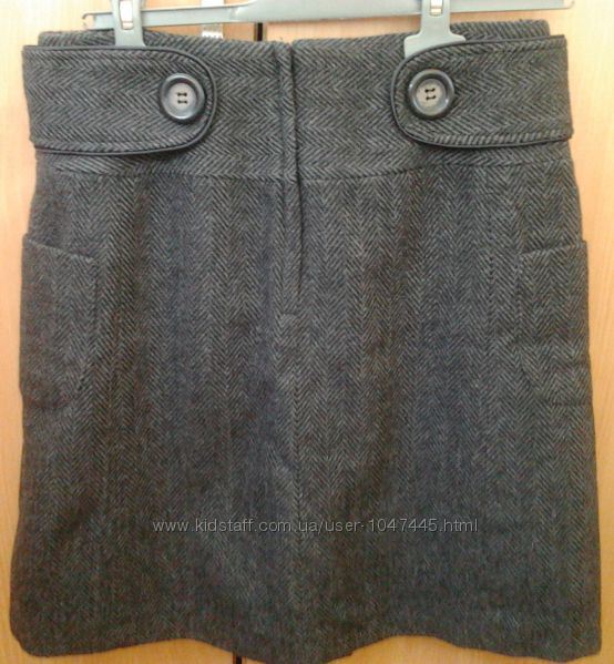 Теплая юбка на подкладке с декоративными пуговицами и карманами по бокам. Впереди складка. Размер 44-46. Состав: 40% шерсть, 60% полиэстер. Длина 51 см, обхват талии - 79-80 см, бедра 108 см. Новая, но без бирки.Оплата на карту Приватбанка.