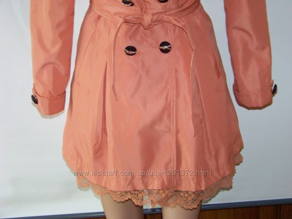 Романтичный женский плащ... ткань с пропиткой, отталкивает воду, с нежным ажурным кружевом по низу... в наличии приглушенный оранжевый... можно носить как с поясом, так и без него...В наличии приглушенно-оранжевый L (реально S\M).