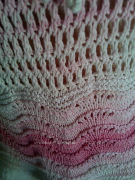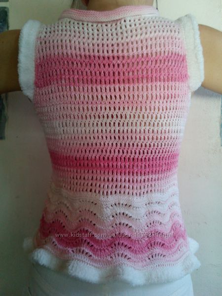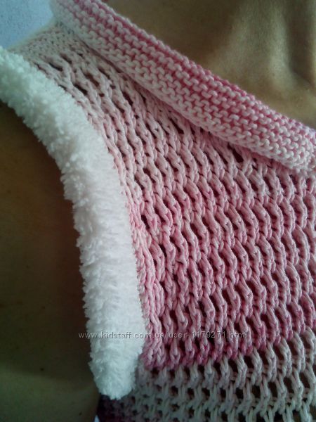 Нежный топ в розово-белой гамме. Очень мягкий, хорошо пропускает воздух, в нем не будет жарко. Эластичный, не сковывает движений и не обтягивает. Такой топ будет только у вас, так как связан в одном экземпляре.По низу топа белая пушистая отделка, и такая же по пройме. Маленький воротничок и завязки, которые можно не завязывать.