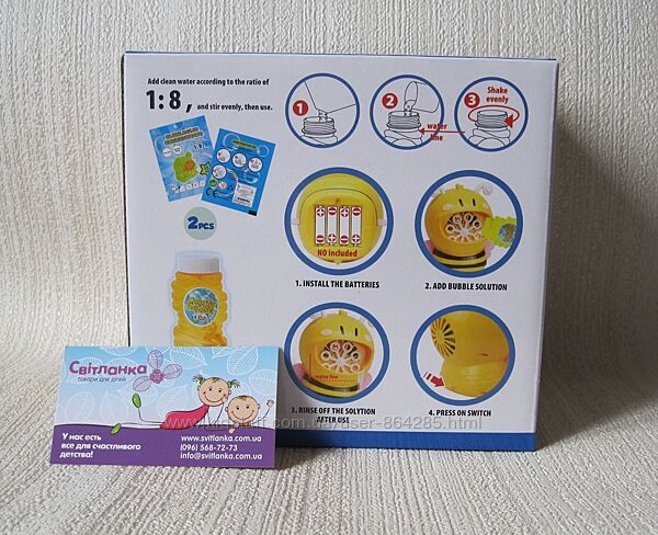 Чтобы ее активировать необходимо вставить батарейки типа «АА» (в комплект не входят). Кнопка включить/выключить находится сзади игрушки. А для того, чтобы пузыри начали выдуваться, залейте мыльный раствор в рот игрушке.