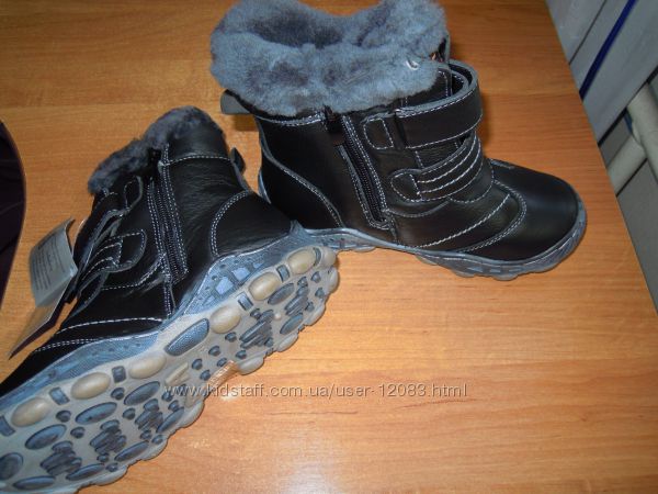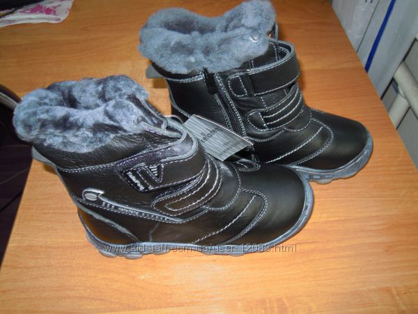 Кожаные детские ботинки под любые штаны. Материал верха натуральная кожа. Внутри мех ― цигейка. Застегиваются сбоку с внутренней стороны на змейку и спереди на две липучки, с помощью которых можно отрегулировать объем ноги. Подошва из высококачественной резины, которая не твердеет на морозе, а значит и не скользит. Подошва заклеена фирменным качественным клеем. Комфортно, удобно и ногам тепло.Очень прочные и хорошо носятся.