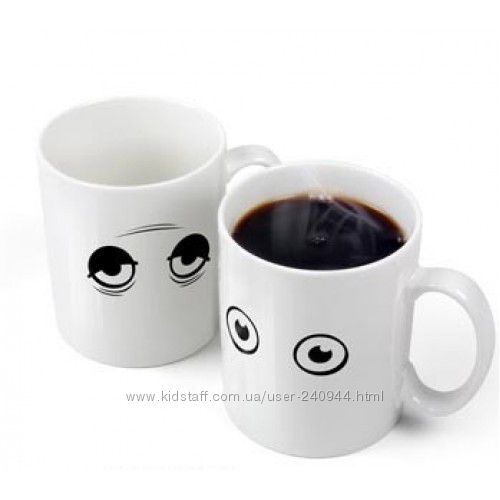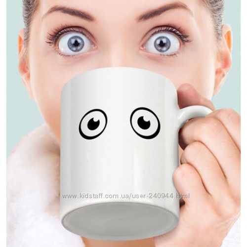 Дело в том, что чашка с заспанными глазками тут же проснётся, как только налить в неё горячий чай или кофе. За этим процессом интересно понаблюдать: веки постепенно как бы поднимаются, и вот уже на нас смотрят слегка удивленные, но при этом полностью открытые глаза. Ну как тут не улыбнуться!