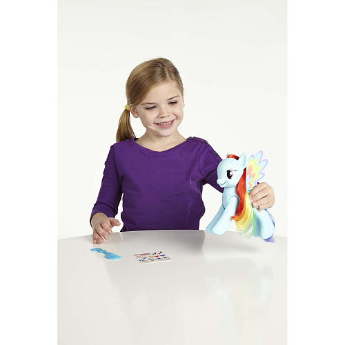 У Рейнбоу Дэш густая, пышная грива, которую можно расчесывать специальным гребешком (имеется в комплекте), а еще ей можно сделать различные прически. Создав красивую прическу, надо еще украсить маленькую пони наклейками в виде сердечек и молнии, которые также есть в наборе. Но и это еще не все! Пони Радуга умеет разговаривать, произнося фразы из мультфильма!