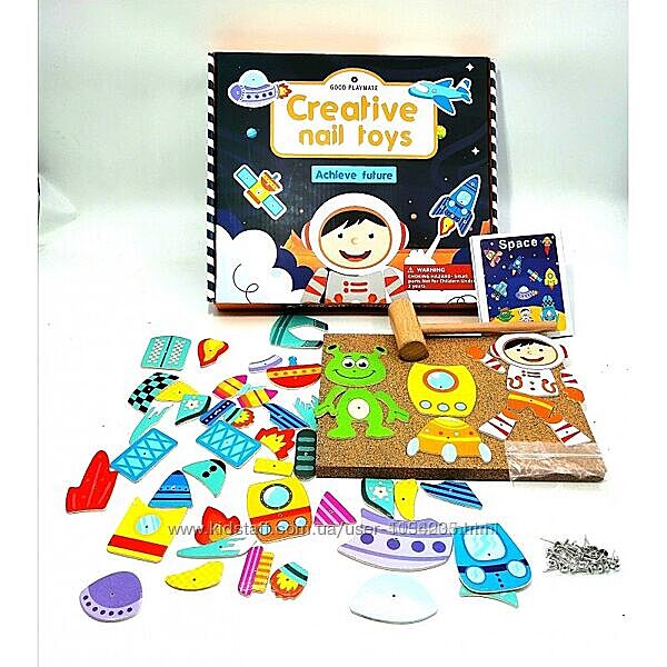 Великолепная игра для детей - деревянная мозаика с молоточком " Динозавры".Игра представляет собой пробковую основу на которую малыш будет " набивать " картинку ( детали мозаики на тему " Динозавры"или Космос и гвоздики). В комплекте книжечка с образцами.