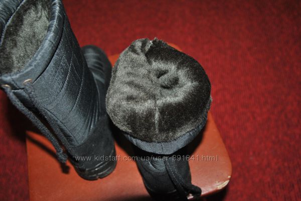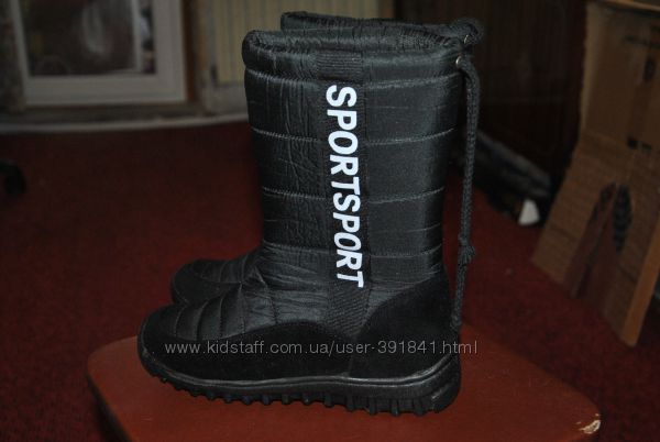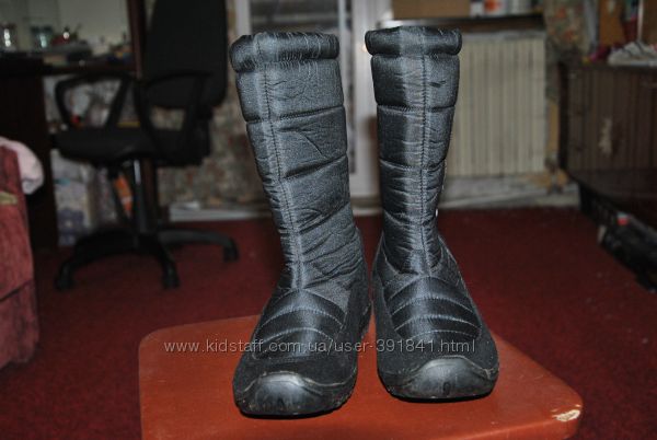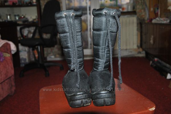 Сапоги типа дутики, верх плащёвка, иск. замша, подошва похожа на резиновую, внутри иск.мех. Размер написан 37, по стельке примерно 23,5- 24см. Ширина голенища 33см, есть шнурок для утяжки. Высота от пола 27см В отличном состоянии, без нюансов. Брали на иностранном сайте -не угадали размер.