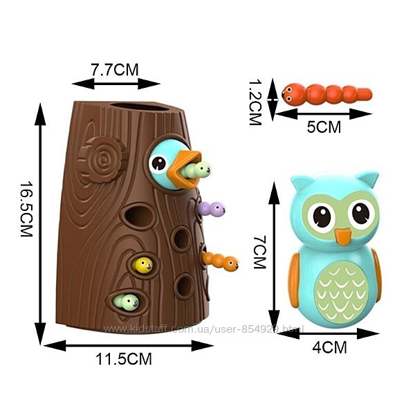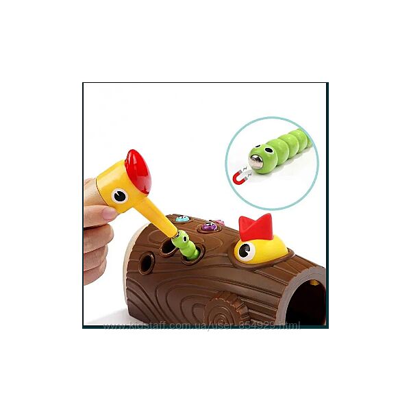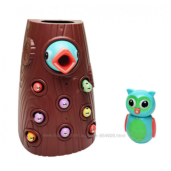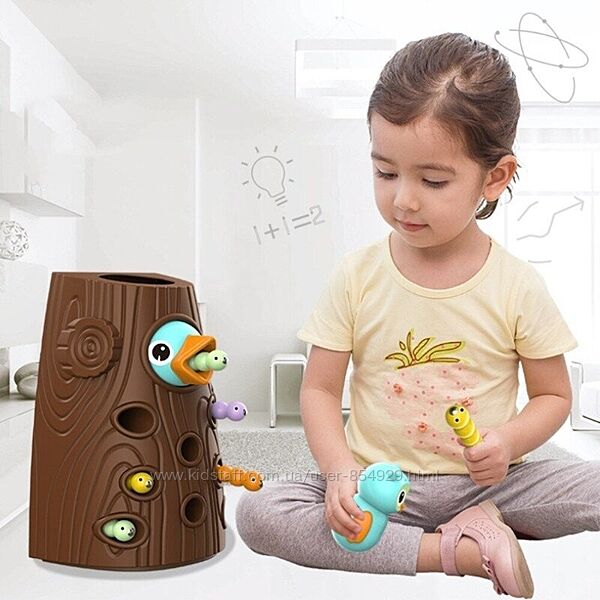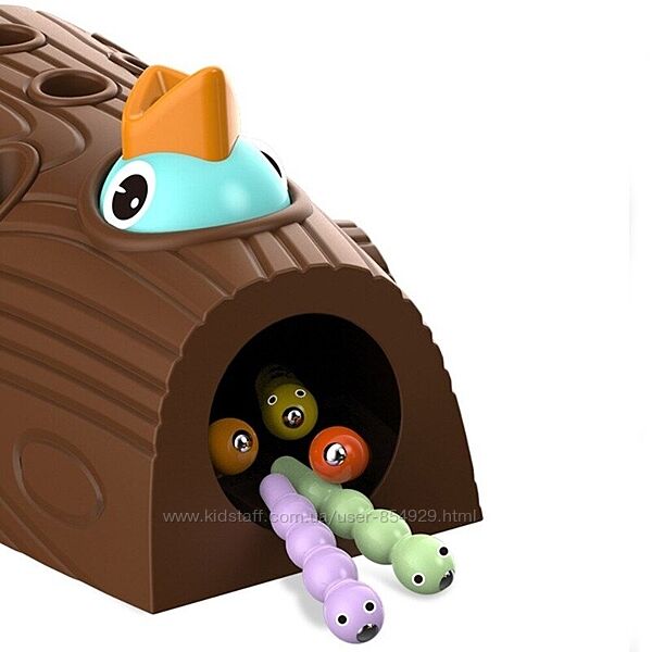Каким образом? Все очень просто! Каждый червячок имеет магнитную головку и спрятан в основу дерева в своей норке! На клюве тоже магнитная основа, с помощью которой можно вытянуть червячка!