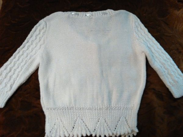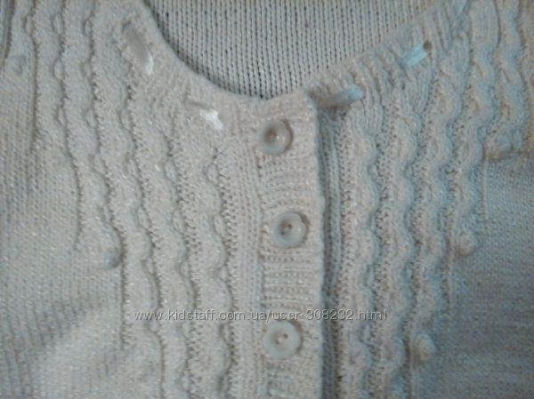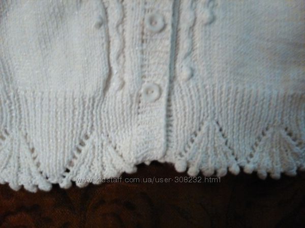 Нежный белоснежный кардиган ручной работы для Вашей красавицы. Придаст очарование любому наряду. Рукав 3/4. Ажурная вязка, интересные детали. Х/б пряжа высокого качества. Не теряет формы после стирки. Очень мало б/у. В идеальном состоянии.