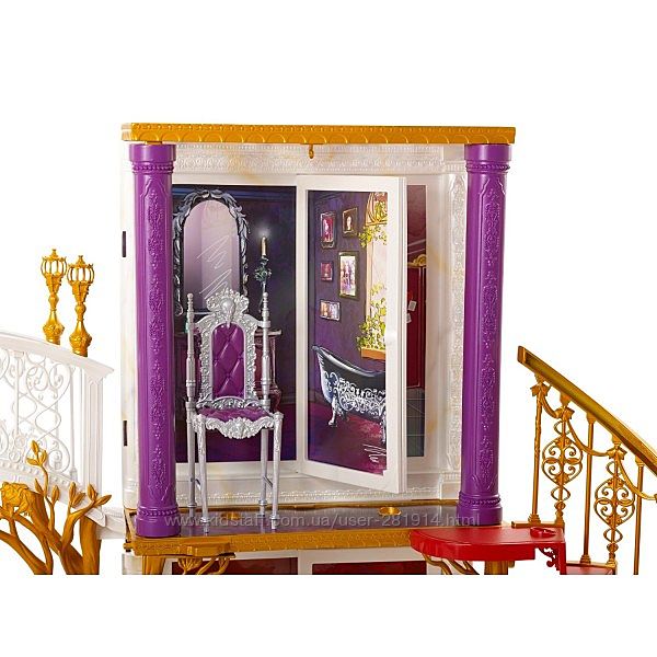 Великолепный игровой набор - замок Эвер Афтер Хай с двумя башнями и двухэтажными меблированными апартаментами, соединёнными хрустальным мостиком. С этим прекрасным замком Вы окунетесь в непревзойденную сказку школы Долго и Счастливо. Для настоящих принцесс, настоящее королевство. Для балов и приемов, для гостей и ухажеров.Для кукол созданы все условия: столы, стулья, зеркала, шкафы - всё в двойном комплекте. И это не случайно-ведь в одной части этого замка может жить одна принцесса, а во втором - другая. А в гости куколки смогут ходить к друг другу по хрустальному мостику.