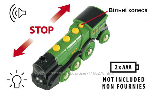 Brio 33592/33593 ПаровозМоже рухатися вперед та назад. При русі вперед світяться передні фари, при переміщенні назад горить червона лампа позаду. За допомогою перемикача колеса можуть бути розблоковані для переміщення вручну. Оснащений звуковим сигналом. Працює від батарейок 2 х ААА. Ціна за 1 штуку.