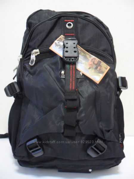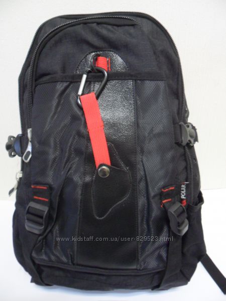 Рюкзаки спортивные "Polar". 30 литров. Цвет черный. Для города, спорта и мелких поездок. Плотная, прочная ткань с пропиткой. Надежные долговечные молнии с широкими бегунками. Лямки и торцы рюкзака дополнительно укреплены искусственной кожей с продетым внутри стальным тросиком. Благодаря этому нагрузка равномерно распределяется по всему телу. Спина плотная, с сеточкой. Плотные лямки. Уплотненное днище. Ремень для крепления на поясе, - для удобства езды на велосипеде. Боковые стяжки. Два вида рюкзаков. -- Рюкзак с черной защелкой. Размеры: 46 х 28 х 20 см. Два больших и одно небольшое отделения на молнии, в одном из которых есть отдел для планшета. По бокам рюкзака расположены два небольших (13 х 16 см.) кармана-сеточка.-- Рюкзак с карабином и с красной сигнальной ленточкой. Размеры: 50 х 31 х 23 см. Два основных отделения на молнии, в одном из которых (спина) расположены отдел для планшета и маленький карман на молнии. Под карабином еще одно, небольшое отделение. По торцам рюкзака два маленьких кармашка размером 15 х 18 см. каждый.