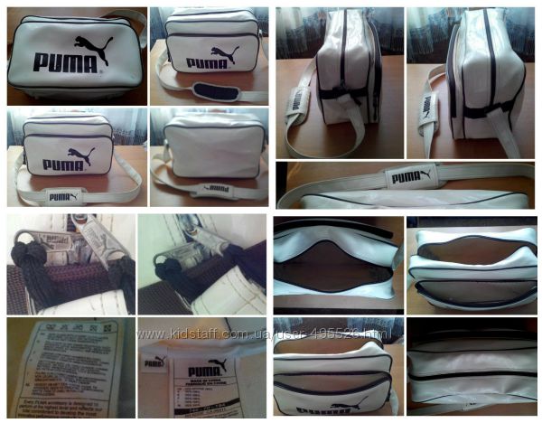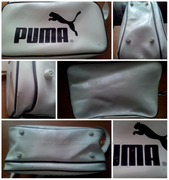 1. фирменная спортивная сумка PUMA, винил, б/у, состояние хорошее, смотрите фото , немного порисована ручкой , есть незначительная потертость. дыр, порезов нет. нюансы отображены на последнем фото. Размер: 36,5 (по середине сумки) х 25(высота сумки по середине) х 12,5(ширина дна по середине)+3 см, боковушка - 12,5 +3 см , длина ручки - 120 см, регулируется. материал - винил - очень плотный, сумка реально неубиваемая. цвет скорее молочный, чем белый.