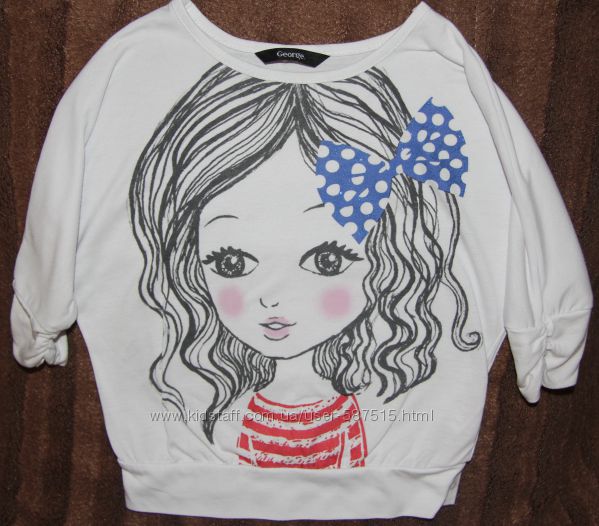 Реглан George: белого цвета, с рисунком - девочкой (на бантике и на красных полосочках её кофточки - лёгкое напыление - блёстки. Рукав 3/4,на манжетах присобрано. Размер указан 86-92 см. (тоже большемерит,носили в том же возрасте что и костюм). Состав:66%-полиестер; 34% - вискоза.