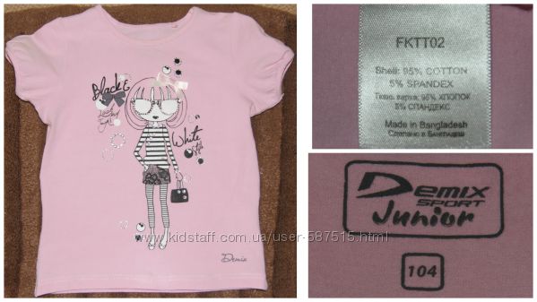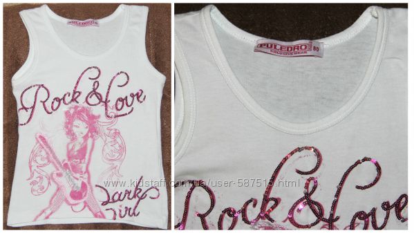 Майка: белого цвета, спереди девочка с гитарой (есть вышивка гладью и пайетками). Замеры: ширина по спинке (от подмышки до подмышки) - 30 см.; длина по спинке (от горловины вдоль позвоночника)- 38,5 см.
