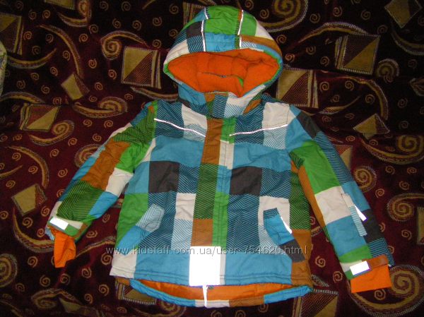 ф 1-2 Теплая веселая, разноцветная осенне-зимняя клетчатая куртка Topolino с голубой подкладкой. Выглядит отлично, подойдет для мальчика 7 лет, рост 122. На бирке 122. Верх крепкая плащевка, защищает от дождя и ветра, внутри флисовая подкладка. Отталкивает воду и прекрасно стирается. На толстом синтепоне, легкая и теплая. Элластичный манжет с отверстием для пальца. Капюшон не отстегивается. На осень и зиму