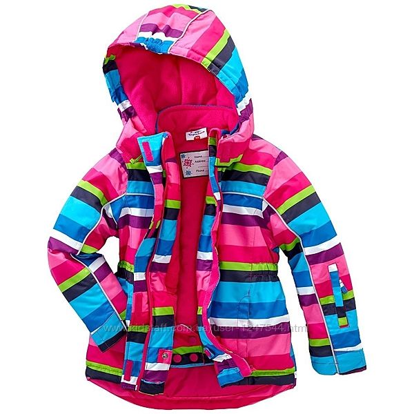Куртка Topolino, флисовая подкладка. В наличии рост 98, 110, 116, 122. Элластичный манжет с отверстием для пальца. Лыжная юбочка. Капюшон несъемный. На осень и зиму. Ткань верха пропитана от дождя и ветраф.1 Куртка Topolino пинк яркие полоски.