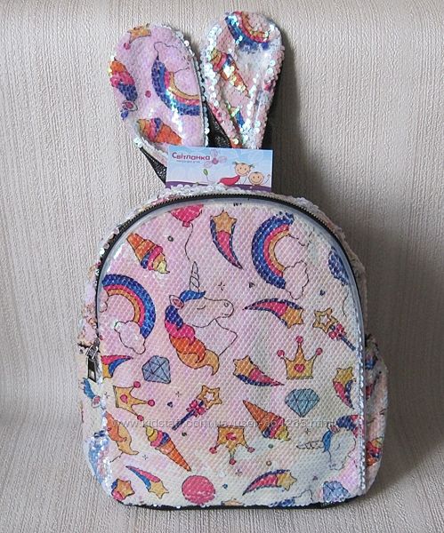 Подробное описание: Рюкзак детский с пайетками, ушками и светом. LOL и единороги.