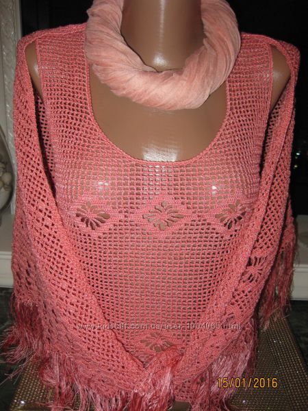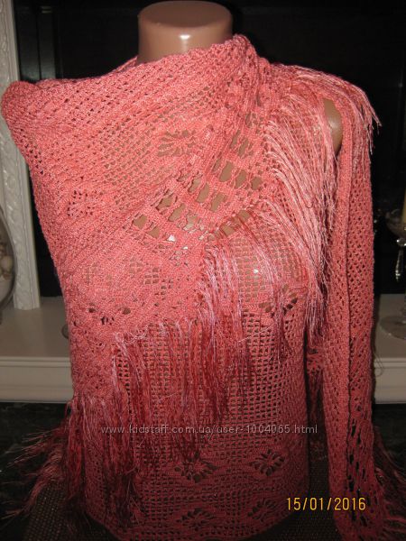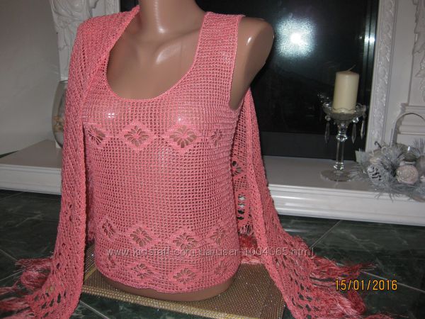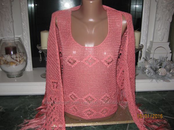 Предлагаю очень нарядный комплект - кофта-майка и шаль, связанный крючком сетка с узором. необычайно красивый коралловый цвет. нить хлопок с вискозой, Замеры по запросу. на любой вопрос с удовольствием отвечу и рада помочь вам.