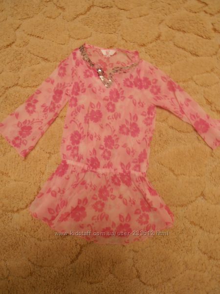 фото 5 легенькая шифоновая туника розовая в малиновые цветы написан рост 128, но мы носили и на рост 116см длина 55см, ширина 33, плечи 25, рукав 3/4 -37см - 45грн