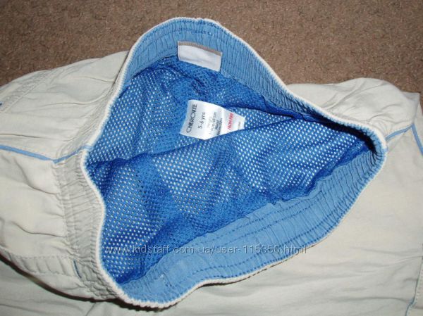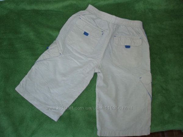 Шорты-капри светло-бежевого цвета с голубой окантовкой. На 5-6 лет. На рост 116 см, но подойдут и на 122-128,если худенький мальчик. Длина по боковому шву 45 см, по внутреннему шву 25 см, ширина пояса в нерастянутом виде 26 см, ширина штанин внизу 20 см. 70% коттон, 30% нейлон. внутри подкладка-сеточка голубого цвета.