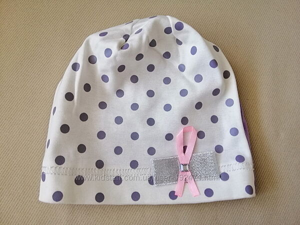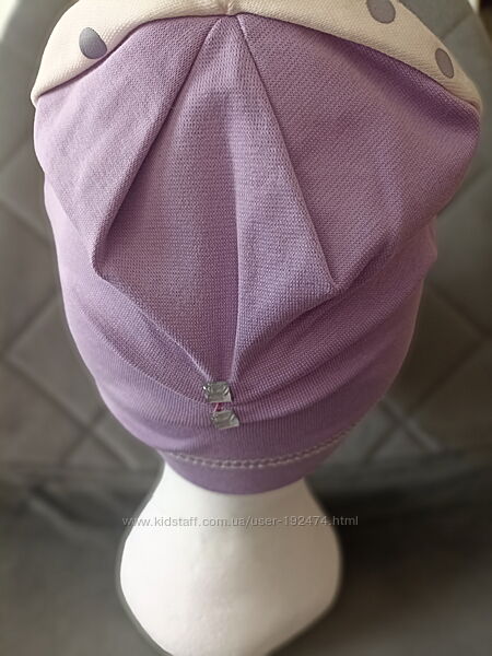 Шапки одношарові з накатом, прикрашені бантиком Виробництво: Україна Склад: 97% - бавовна, 3% - лайкра Розмір універсальний, трикотаж дуже добре тягнеться, на об´єм 50-52-54 (3 - 7років) Напівобхват 21, тягнеться до 33, глибина 20 Колір в наявності: білий в бузковий горох