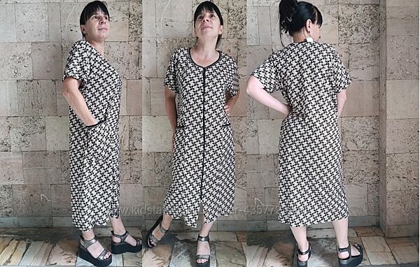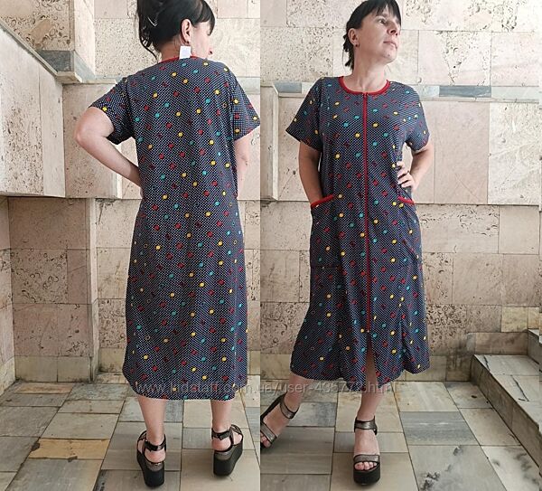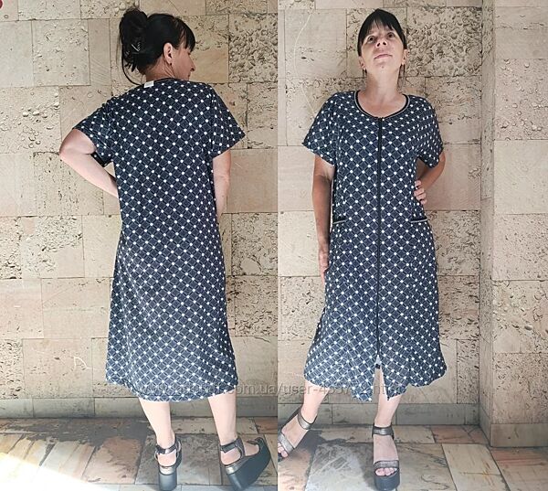 фото 3,4,5,6 Халат на блискавці, з двома накладними, глибокими кишенями. Рукав короткий вільний, горловина прошита бейкою. Кишені також красиво оброблені. Модель вільна та батальна. зріст моделі 155 см.
