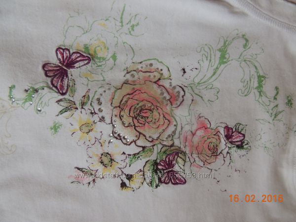 Белая. Покупали в "Антошка". Цветы на футболке украшены стразами.