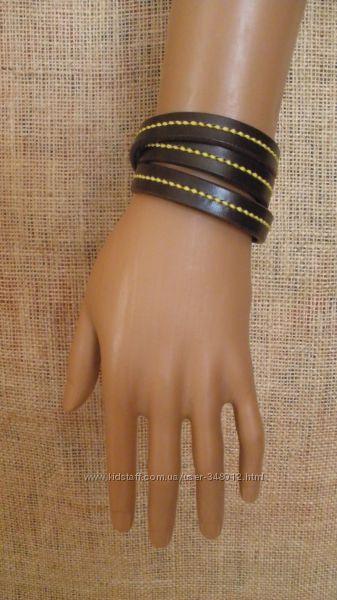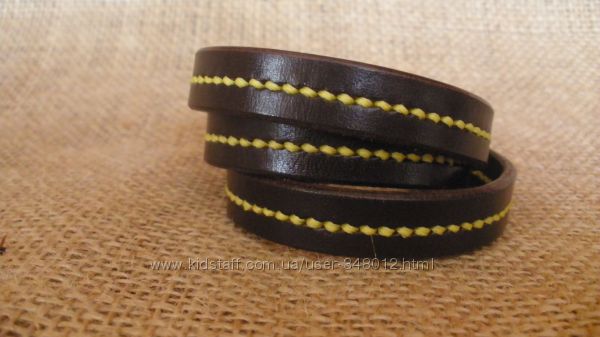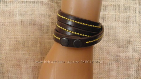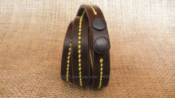 Браслет из натуральной кожи. Ручная работа. Прошит вручную седельным швом вощеной нитью желтого цвета. Толщина: 3-3,2мм. Ширина: 12мм. Общая длина: 55см. Цвет браслета: черный шоколад. Застегивается как на одну, так и на две кнопки. Походит для запястья до 16,5см в обхвате.1. 100% предоплата осуществляется на карту ПриватБанка .