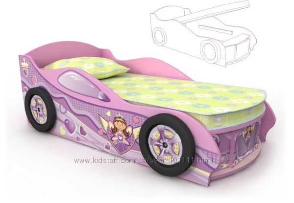 К ровать машина (с накладными, выпуклыми колесами, с наклейками) цвета розовый или лаванда(сиреневый)