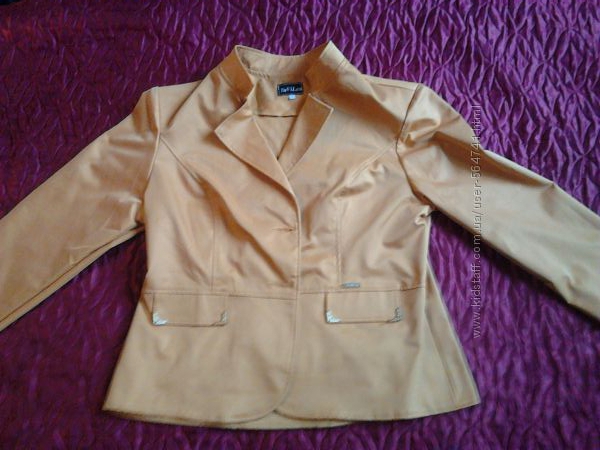 Легкий пиджак без подкладки, приятного горчично-желтого цвета, насыщеннее чем на фото. Указан размер 56, но реально меньше - 52-54. Воротник-стойка, клапаны карманов отделаны металлической фурнитурой. Есть подплечники. Купила по распродаже - нет пуговиц и этикетки, но абсолютно новый. О возврате прошу договориться при покупке. Мерки: спинка - 61 см, рукав - 63 см. Подмышки сзади - 54 см, впереди больше за свет выточек.