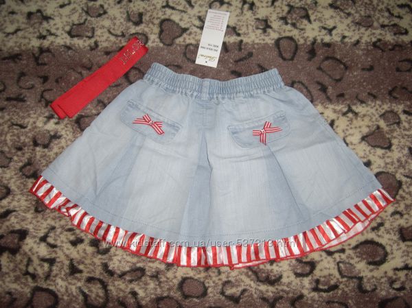 Красивая юбочка с кармашками Deloras, есть красный поясок ( с надписью стразами названия фирмы). Указан 116 рост (4-6лет), но можно и на рост больше/меньше. Длина 29см, ПОТ - 23+резиночка хорошо тянется.Ткань джинсовая, котон облегченный + атласные рюши и поясок. Цена 100грн.Есть красивые футболочки под юбочки, можно подобрать комплект.