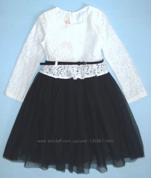 Фото 5- Элегантное платье с кружевным верхом белого(молочного)цвета с многослойной черной юбкой из фатина и тюля, лаковый черный пояс