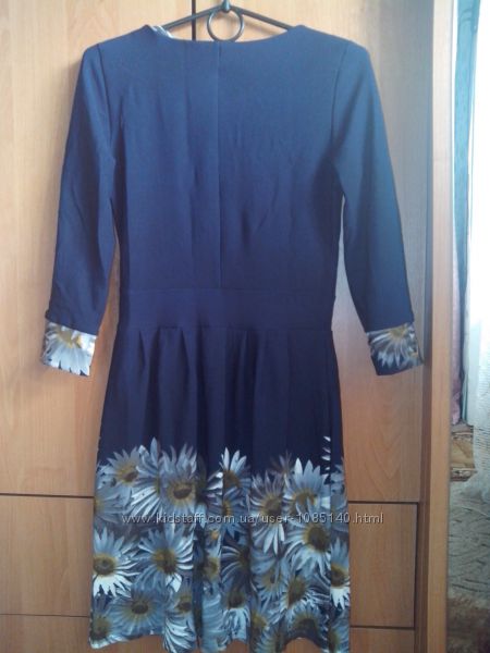 Фото 1-3Нежнейшее платье тёмно-тёмно синего цвета с красивейшими цветами ( ромашками ) по подолу юбочки, на манжетах и горловине.