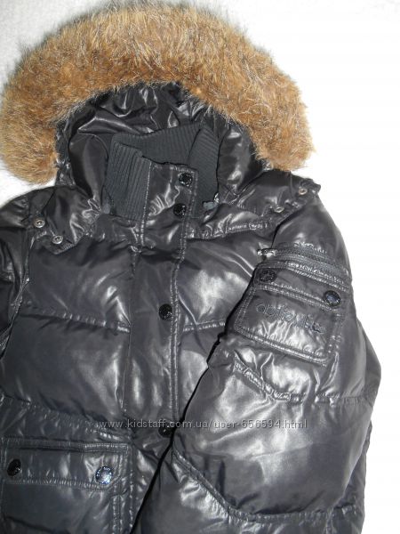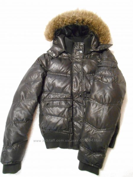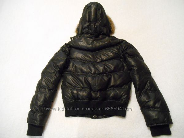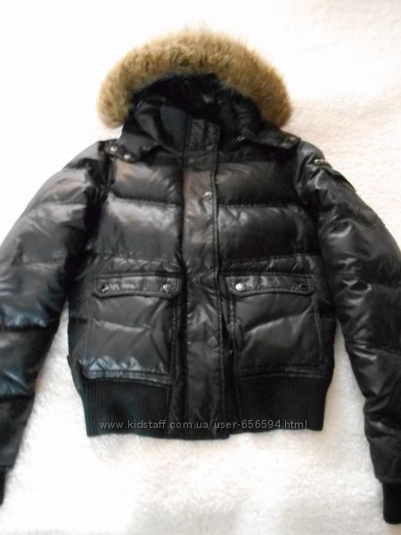 Куртка на молнии и кнопках из болоньевой ткани. Есть внутренний и внешние карманы. Съемный капюшон с затяжками-резинками с фиксаторами. Мех искусственный съемный. На рукаве карман на молнии. Низ, воротник и манжеты выполнены трикотажной резинкой. Куртка теплая. Утеплитель: 90% пух, 10% перо. Размер L, но может подойти и на М, смотрите замеры.Замеры: