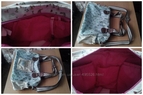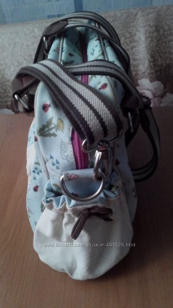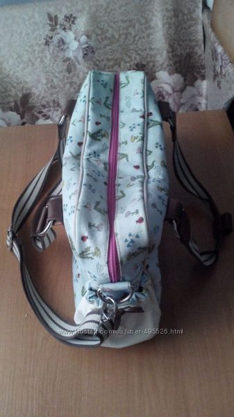 сумка б/у, состояние хорошее, смотрите фото . все нюансы отображены на последнем фото, есть незначительная потертость , немного протерлось ламинированное покрытие , на боковом кармашке утерян один бантик из полиуретана, зеркальце пластиковое с трещинкой и затерто. дыр, порезов нет. подкладка чистая в отличном состоянии.