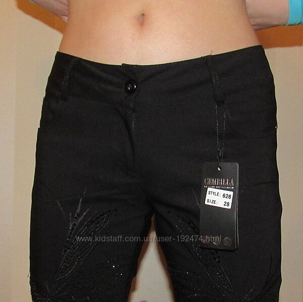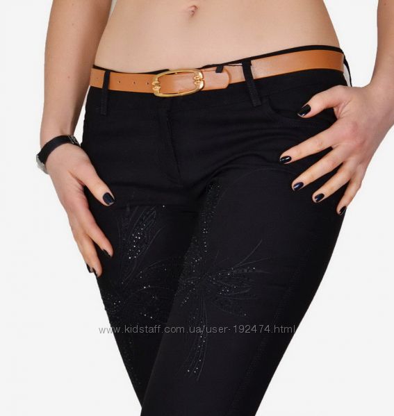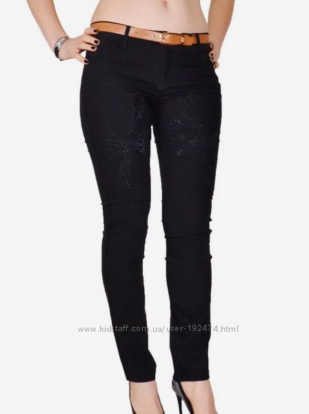 Чорні жіночі стрейчові штани з поясом та кишенями, спереду та ззаду на кишенях вишивка "метелик" прикрашена чорними стразами. Якість дуже гідна. Розмір 27, український 44 - 46 Заміри: Напівобхват талії 36-42 Напівобхват стегон 43-53 Довжина 105, крокова 83