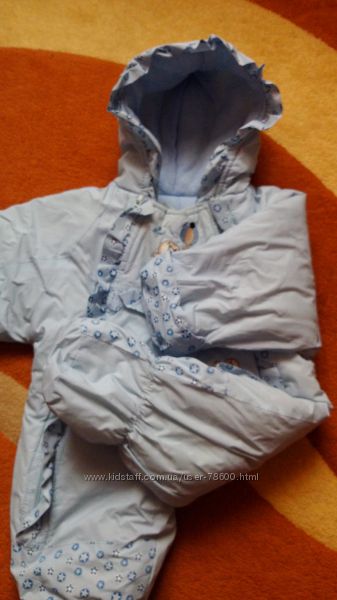 Деми -сезонный комбинезон нежно- голубого цвета производитель Китай качество хорошее состояние тоже утеплен синтепоном следы носки только в середине( есть катышки на подкладке )замеры длина от плеча 68см ножки зарыты шаг 28 см.рукав реглан 37см.закрывается варешкой