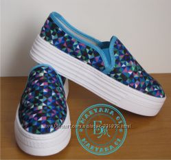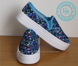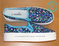 Верх - плотный текстильный материал. Прочный, хорошо чистится. Высокая подошва. Слипоны очень мягкие и удобные. Отличное качество.