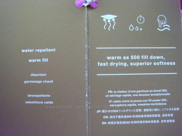 Наполнитель PrimaLoft имеет длинноволокнистую структуру, благодаря которой он лучше и быстрее восстанавливает свой объем, чем похожие материалы. Даже после огромного числа стирок и сушек материал не деформируется. Волокна наделены водоотталкивающими свойствами, которые помогают любой жидкости стекать или испаряться. Это обеспечивает постоянную сухость изделий из утеплителя PrimaLoft.