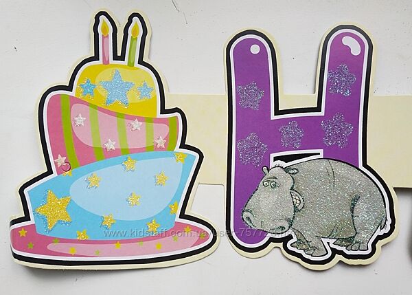 Яркая гирлянда-растяжка "Happy Birthday" картонная со зверюшками, длина 150 см, высота букв 11.5 см. Буквы украшены блестками.Пересылаю Укрпочтой или Новой почтой после 100% предоплаты на карточку Приватбанка