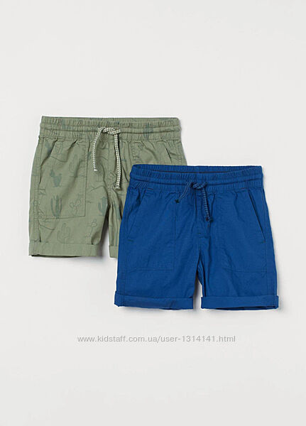 Шорти з повітряного бавовняного плетіння, одна пара з повним принтом. Має прикриту еластичну гумку, шнурок на талії та імітацію шлейфа. Накладні передні кишені та задня кишеня