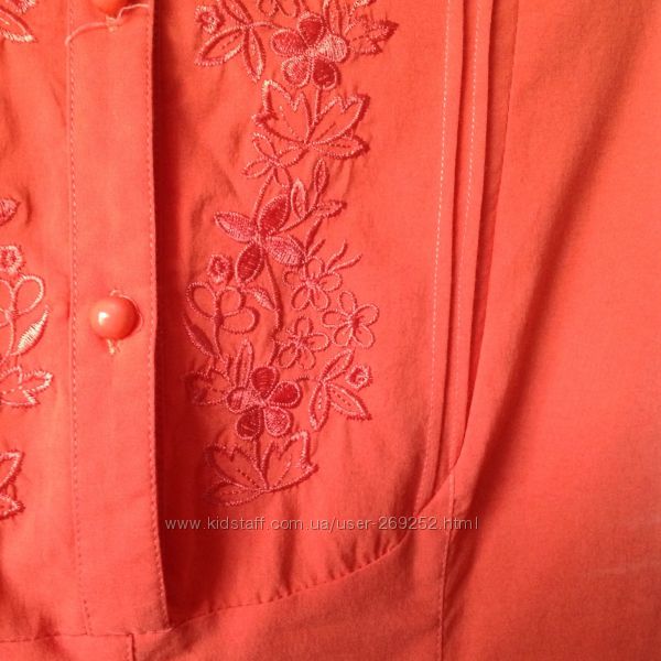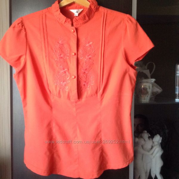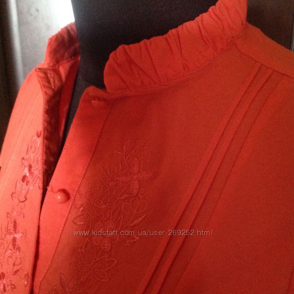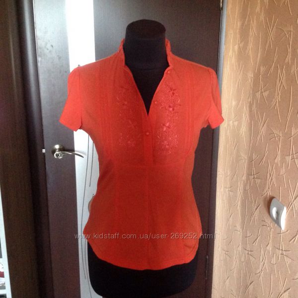 Яркая красивая блузочка производства Польши. Состояние новой вещи. Ни одного дефекта и следов носки нет. Ткань блузочная стрейчевая, хорошо тянется и красиво облегает фигуру. Рукав японка. Вышивка гладью такого же цвета, как блузка. Белые блики на вышивке - это дефекты фото. В реальности вышивка однотонная и красивая. Размер производителя ХЛ. Наш 50. Одето на манекен стандартного 48 размера.