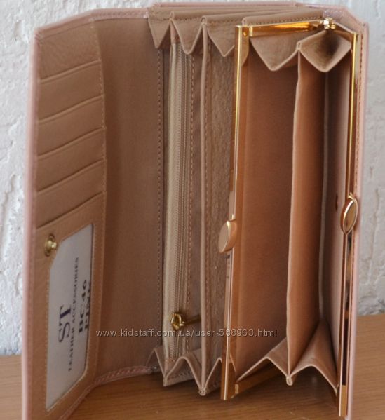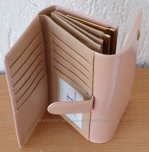 *внутри три отделения для купюр, отдел на молнии, карман, 4 кармашка для карт, прозрачное окошко и отдел на поцелуйчике.