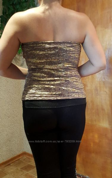 Топ, из буклированной (под парчу) ткани, золотой расцветки,немного тянется, можно носить как под пиджак, так и без, на груди, вставка из чашек, которая придаёт форму груди, в отличном состоянии. Замеры: Пог-38-42см, ширина по низу-41-46см Длина по боковому шву-35см.Другие объявления продавца