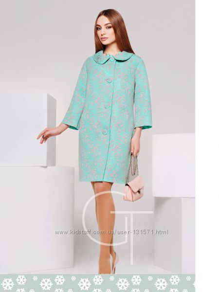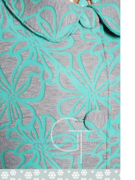 Женственная модель полуприлегающего силуэта, длинной выше колен. Кардиган выполнен из неопрена дополненного рисунком.Верх оформлен отложным воротником с закругленными краями.