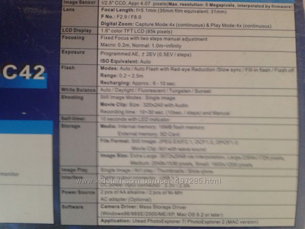Тип камеры-цифровая . Объектив:Фокусное расстояние (35 мм эквивалент) 31 мм. Диафрагма-F2.9. Матрица: Общее число пикселов-4.23 млн Размер-1/2.5" Кроп-фактор-6.02 Максимальное разрешение-2816 x 2120 (интерполированное) Глубина цвета-24 бит Чувствительность-100 - 400 ISO. Функциональные возможности: Баланс белого-автоматический, из списка Вспышка-встроенная, до 2.50 м, подавление эффекта красных глаз . Режимы съемки:Макросъёмка-есть Режим серийной съемки-нет Таймер-есть . Видоискатель и ЖК-экран: Видоискатель-оптический ЖК-экран-85000 точек, 1.60 дюйма . Экспозиция:Выдержка-1/4 - 1/1000 с Ручная настройка выдержки и диафрагмы-нет Экспокоррекция +/- 2 EV с шагом 1/2 ступени . Фокусировка:Подсветка автофокуса-есть Фокусировка:Подсветка автофокуса-есть Минимальное расстояние съемки-0.2 м . Память и интерфейсы:Тип карт памяти-SD Объём встроенной памяти-16 Мб Форматы изображения-1 JPEG Интерфейсы-USB 1.1 Питание:Формат аккумуляторов AA-совмеcтимый . Запись видео и звука: Запись видео-есть Максимальное разрешение роликов 320x240 Максимальная частота кадров видеоролика 15 кадров/с Время записи видео30 секунд Запись звука-есть. Размер 94x66x41 мм. Производитель: Германия. Комплектация: коробка,фотокамера, чехол, USB-кабель, ремешок на запястье, крышка объектива,карта памяти SD, инструкция.